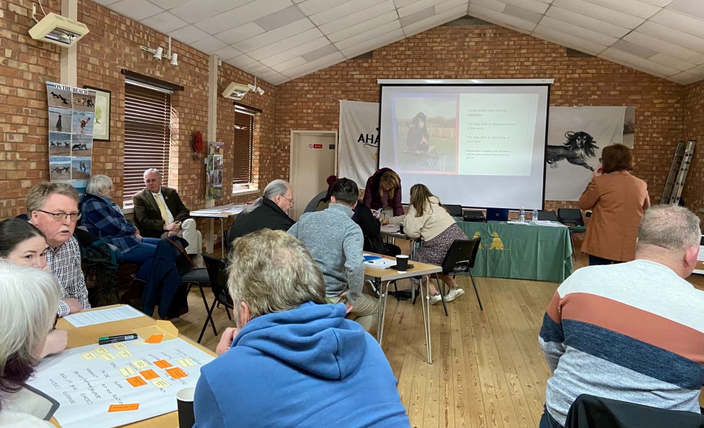 On Saturday 15 April the AHA held their AGM at Ashorne and, as is traditional, they held an event afterwards. This year the title was “LETS TALK ABOUT AFGHAN HOUNDS”. The audience was limited in number and was sold out very quickly. The first part of the day was expertly led by Roberta Hall (Saxonmill) and no-one could say there was not enough time for lots of discussion. Many thanks go to Roberta for an excellent start to what proved to be an excellent day; a really good experience for Afghan and Non-Afghan folk alike with plenty of lively talk and lots of food for thought. Speaking of food this was followed with the usual very well received Bistro lunch and then we used the rest of the day for a Group Mentoring session designed especially for those working their way through the Judges Education Programme and a few thinking of starting. I was so grateful to the AHA committee for producing a good team of hounds who were very patient as they were examined and assessed by 15 mentees.