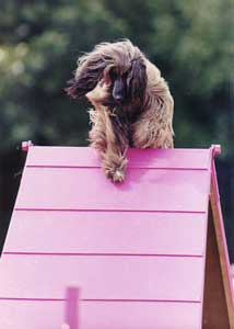 Agility is a performance teamwork sport for dog and handler. In a race against the clock the dog negotiates a course of obstacles off-leash, with the handler running alongside giving instruction and encouragement. Although speed is important, accuracy and precision in doing the obstacles is top priority and the sport requires both good team work and a level of independence from the dog and handler. Moreover agility is fun for everyone involved. Dogs enjoy the speed and freedom, and gain confidence in their abilities as they learn to jump, climb or crawl through agility obstacles. Handlers enjoy the increased bond with the dog as they spend quality time together working out the challenges of the obstacles. Agility strengthens the bond between dogs and handlers, it is fun, and it provides vigorous exercise for both.