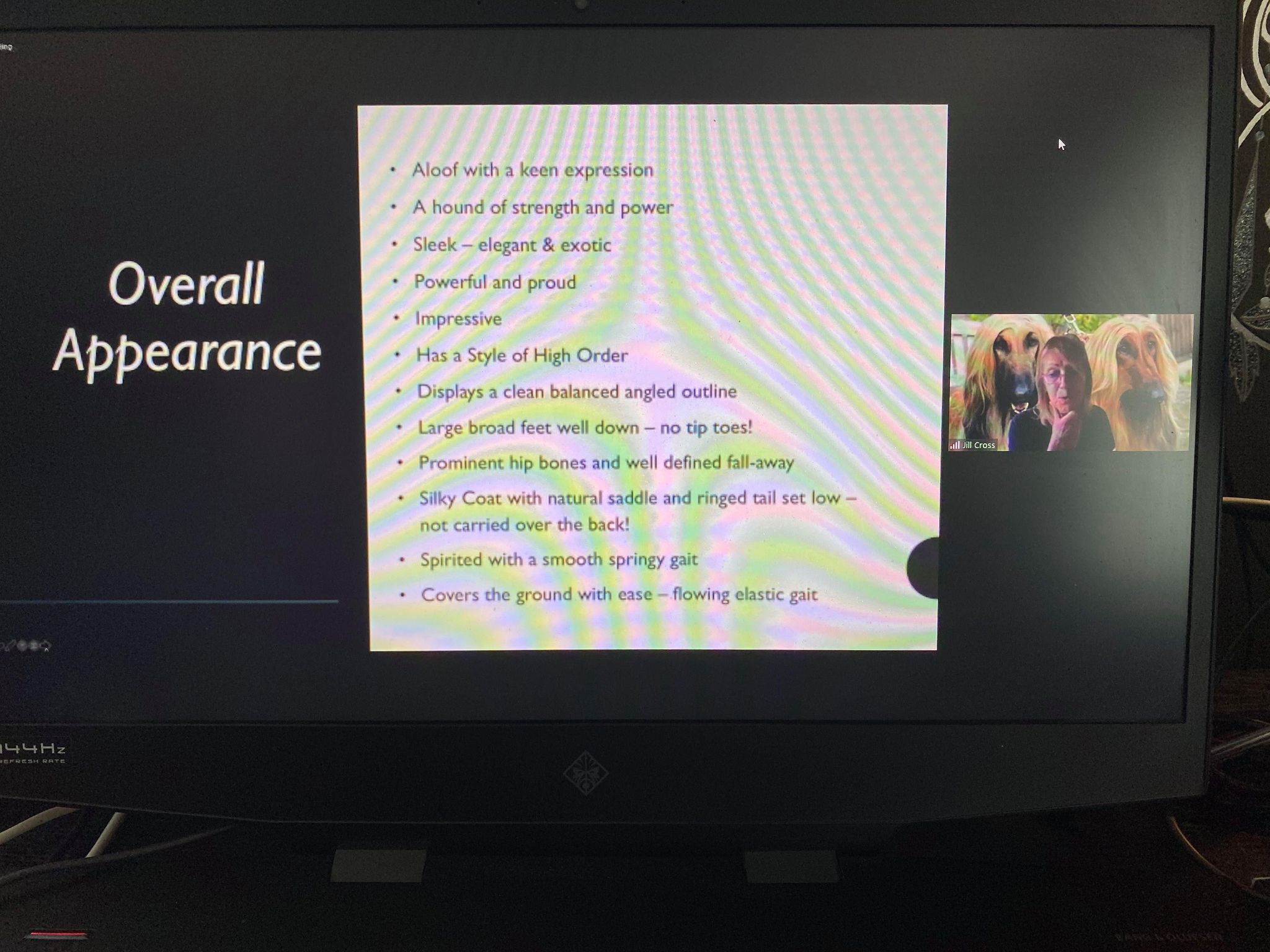 On Saturday March 20th the great online adventure began. A team drawn from the Afghan Hound Association and the Southern Afghan Club worked very hard and together with our expert speaker, Jill Cross (Gilari Afghans) we delivered our fist Breed Seminar followed by our first Multiple Choice Breed Exam. The day exceeded our wildest dreams. Using Zoom we had an attendance of 78 people. The first 20 minutes was spent whilst friends spotted each other and chatted, with many comments about lockdown hairstyles. It was a happy reunion for a lot of us after many months with little activity in the dog world. We were then treated to a professionally delivered and comprehensive breed lecture by Jill with many great images and some stunning videos. Then with the wizardry of the 21st century we managed a well-filled question session to round off the seminar.